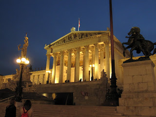 Viele Gebäude in Wien sind besonders bei nächtlicher Beleuchtung sehr eindrucksvoll, wie zum Beispiel das Parlament mit einer Statue der Athena vor dem Gebäude, welche die demokratische Tradition Österreichs ein wenig länger aussehen lässt, als sie tatsächlich ist.