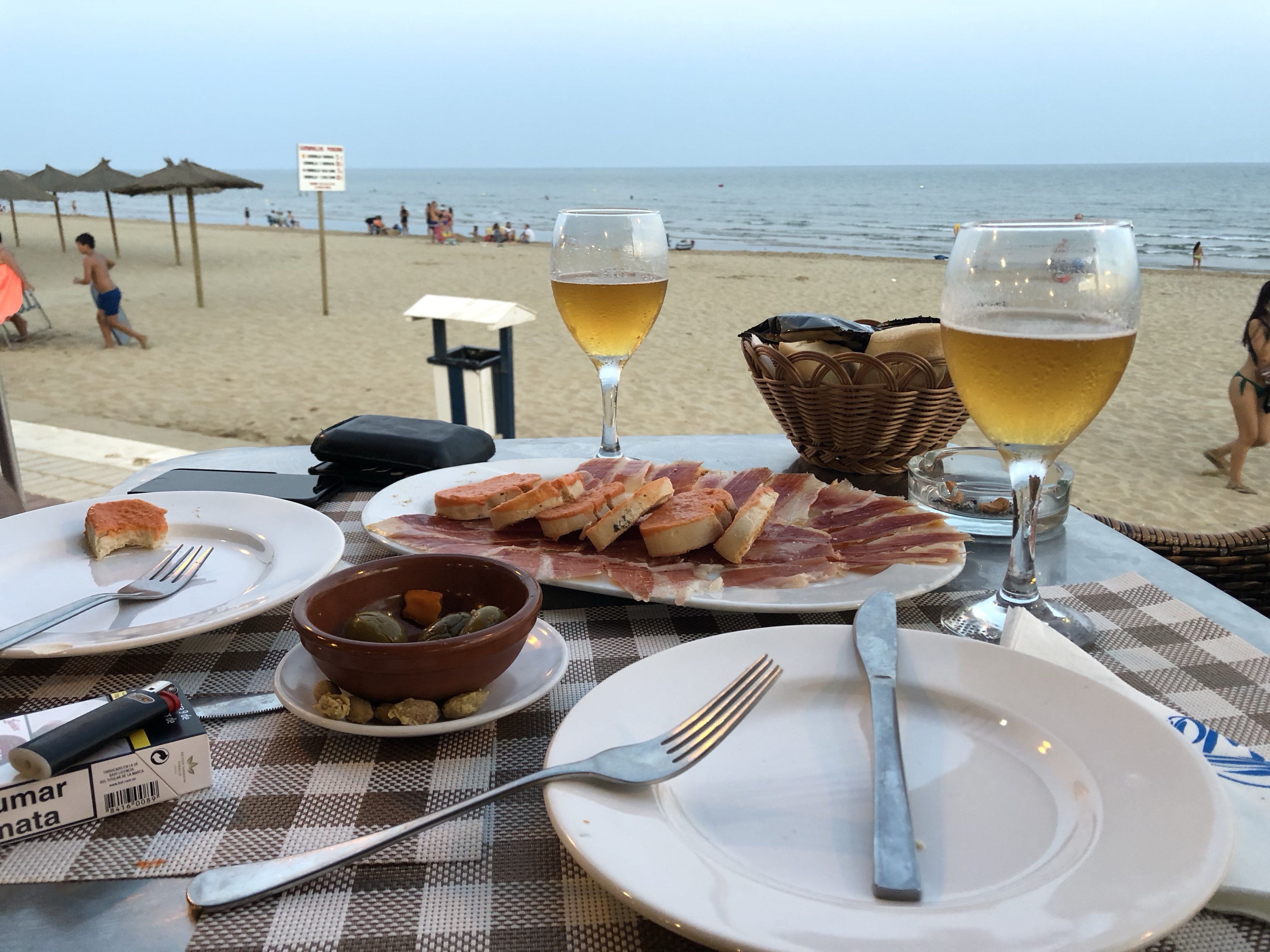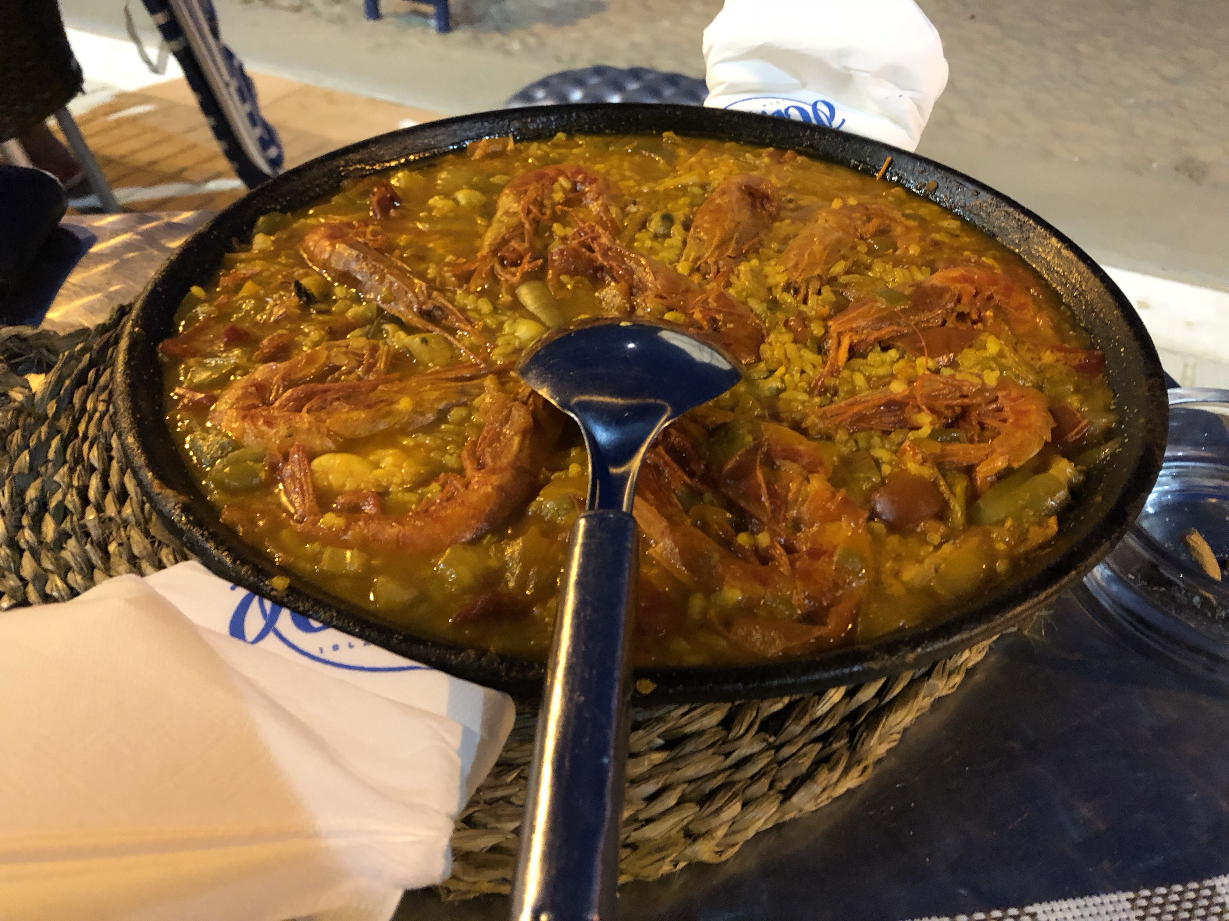 …zum Abendessen einen hervorragenden Jamon als Vorspeise und dann eine Reispfanne mit Riesengarnelen. Sehr köstlich insbesondere, wenn man dabei auf den Strand blickt.