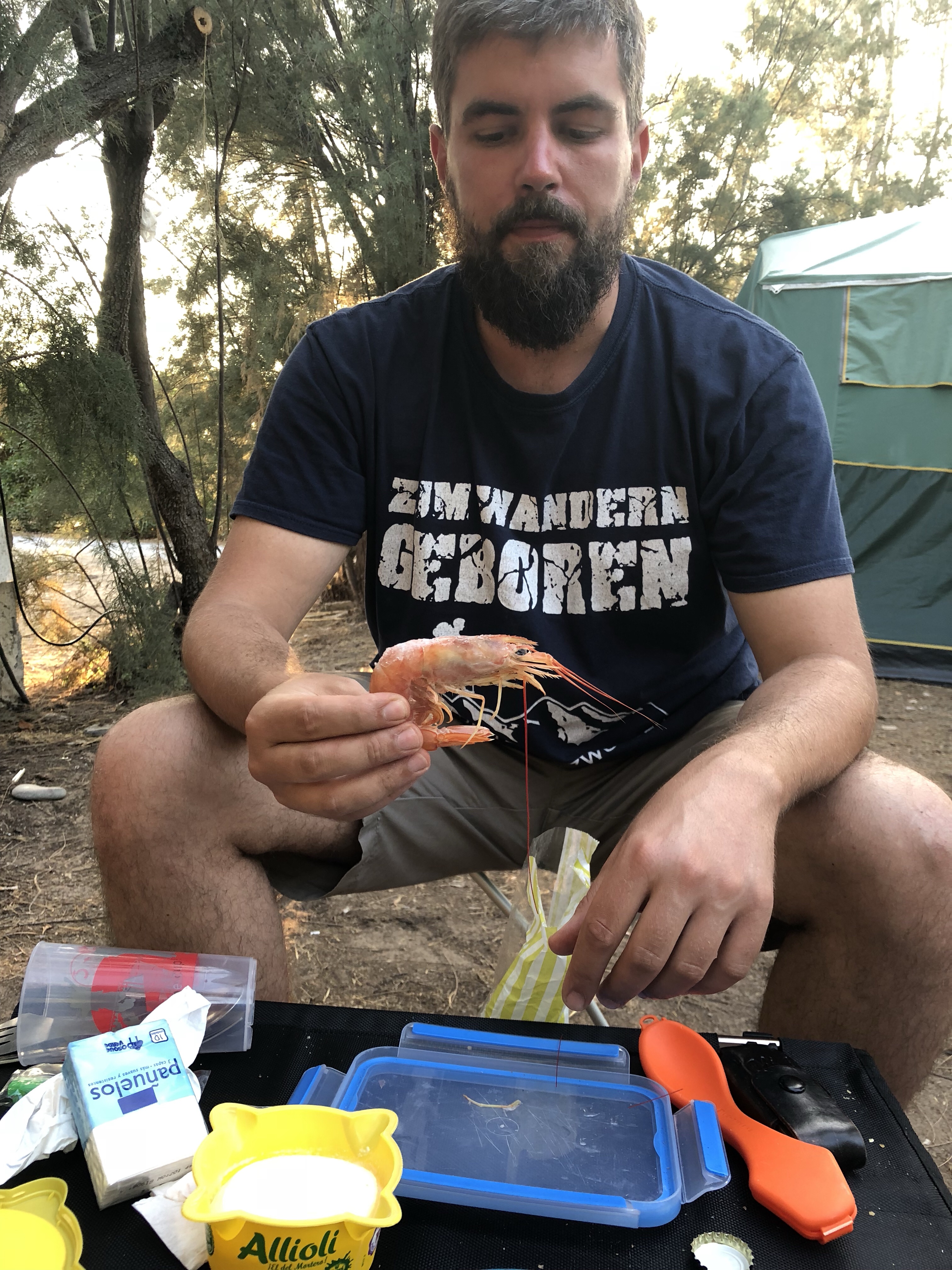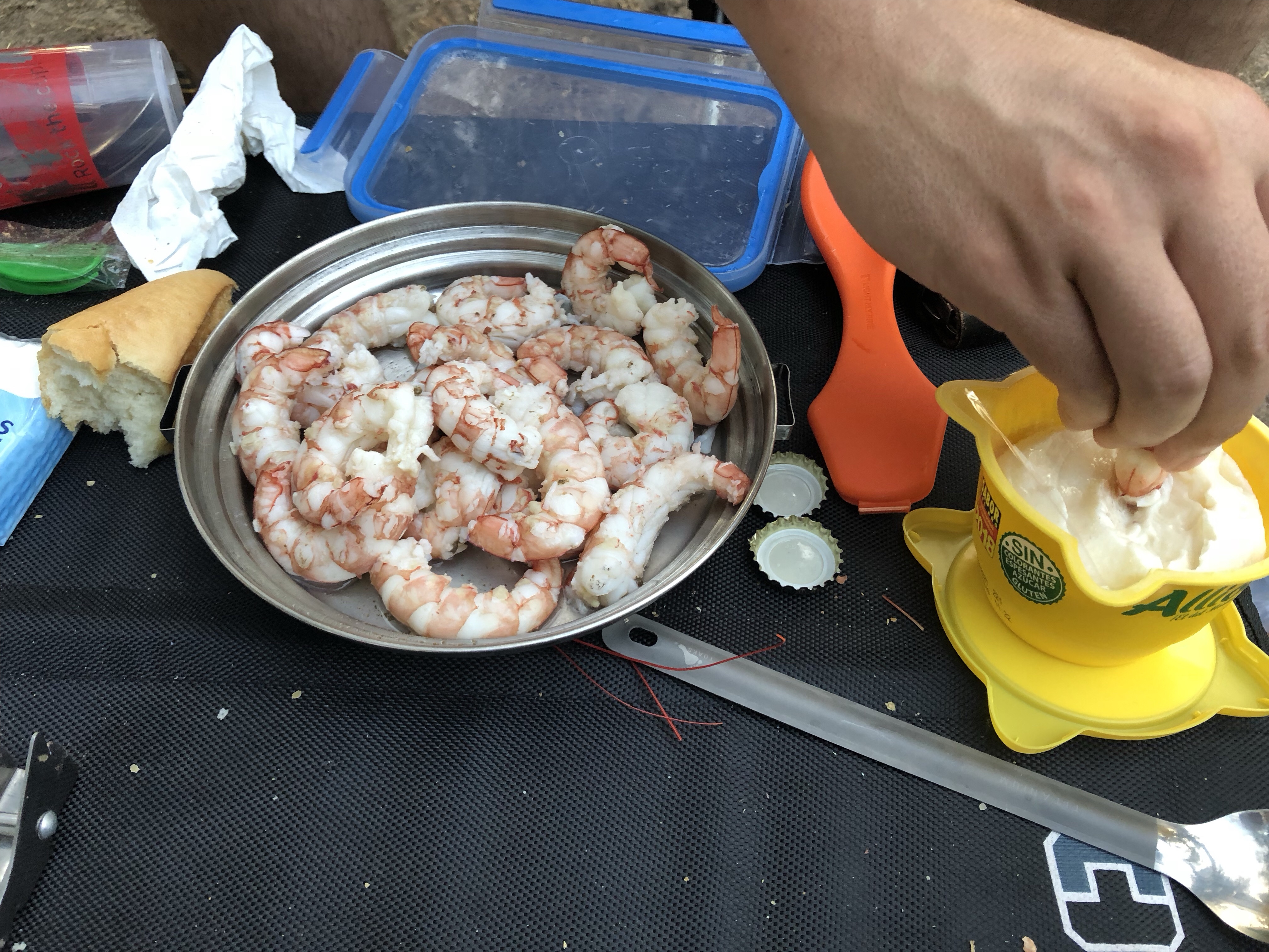 Abends haben wir uns dann vom Supermarkt noch eine richtig leckere “Brotzeit” geholt; Gambas mit Brot Knoblauchsosse und Weißbrot.